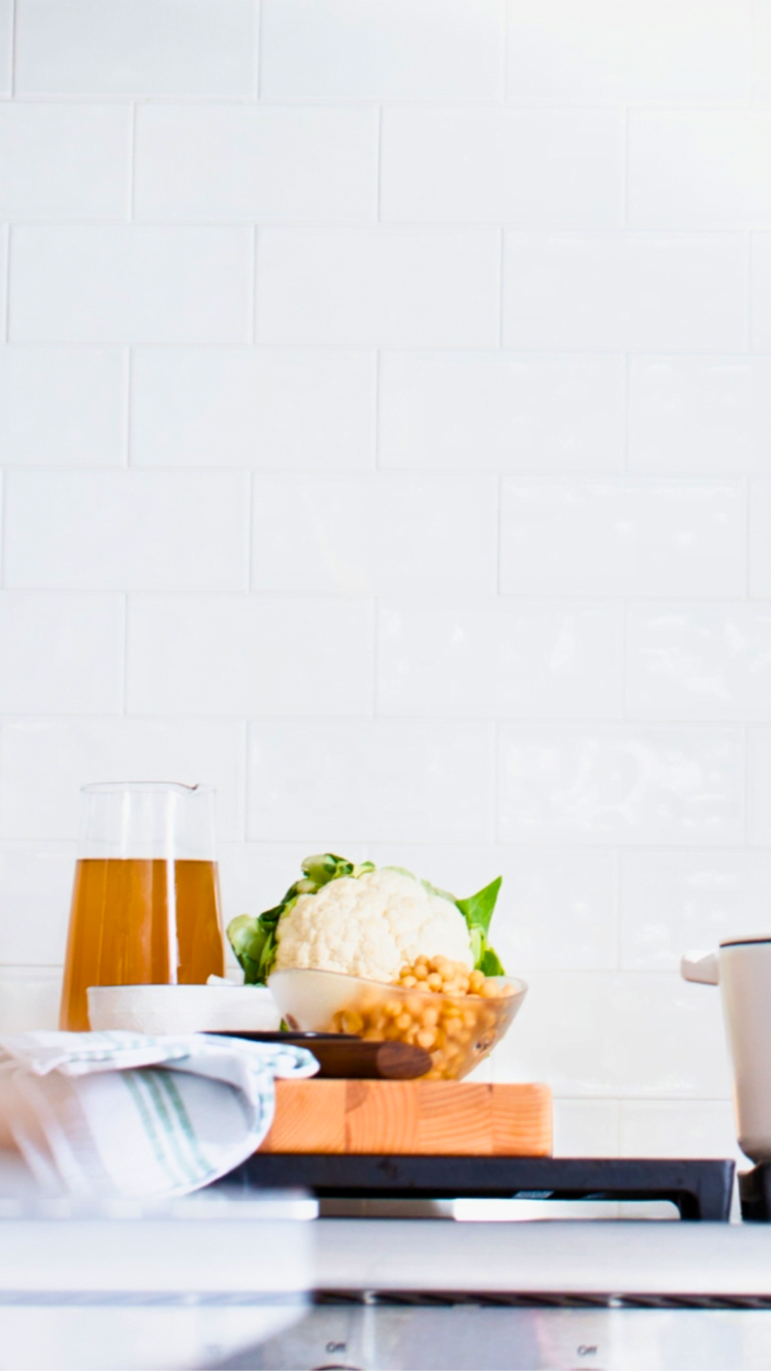 Sopa de garbanzos y coliflor al curry es una deliciosa y cremosa sopa con un toque de especias indias. Se hace con coliflor, cebolla, ajo y jengibre y se cocina a fuego lento con leche de coco y caldo vegetal.