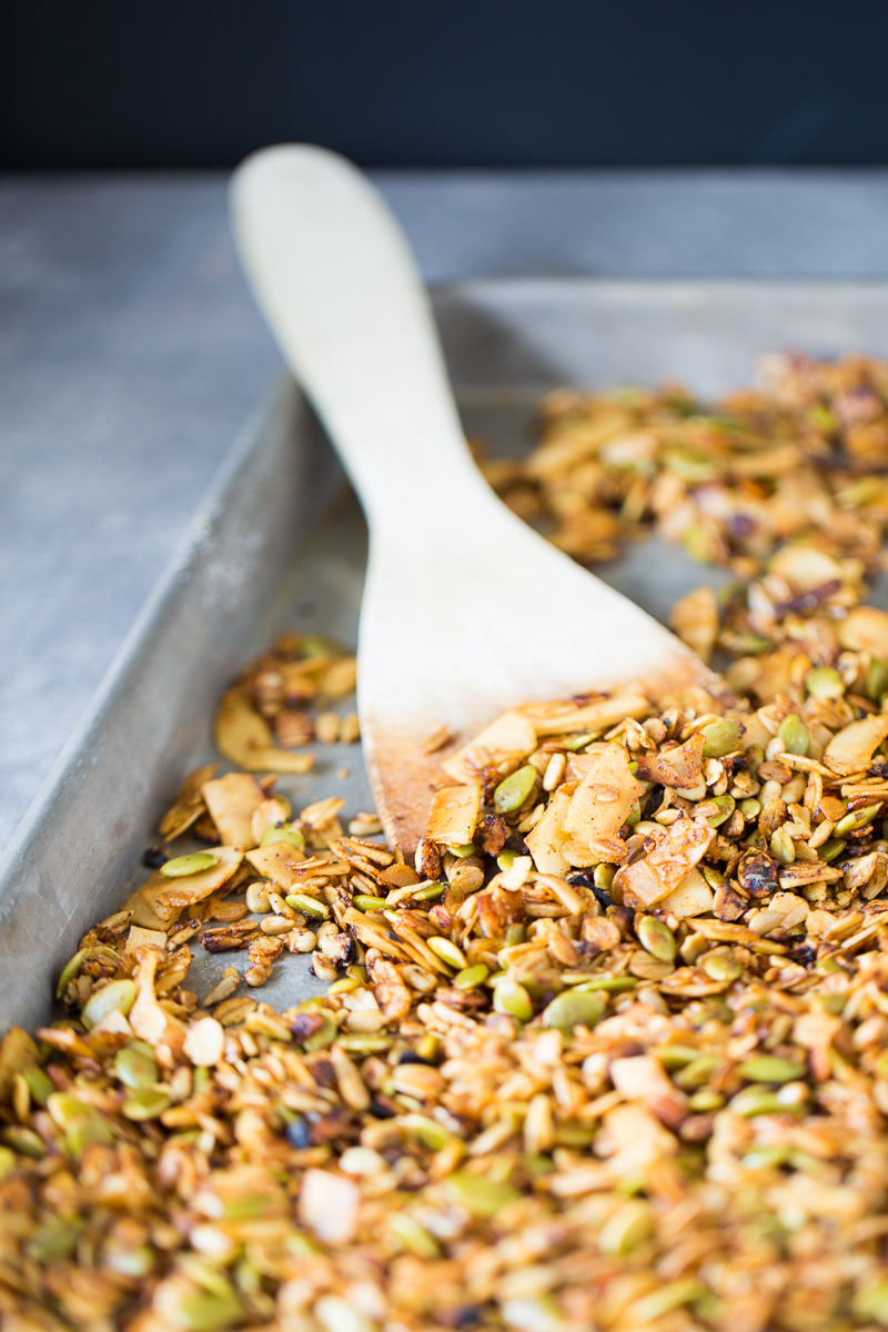 Esta granola está hecha con chile y miel de maple y otros cuantos ingredientes. A mí me pude encantar comerla sobre un pan con aguacate o sola. Mi forma preferida es sobre una ensalada de kale o sobre una mezcla de hojas verdes, con pepino, aguacate y limón.