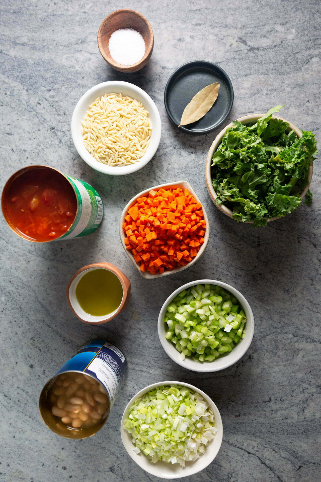Ingredientes de la sopa italiana pasta e fagioli vegana