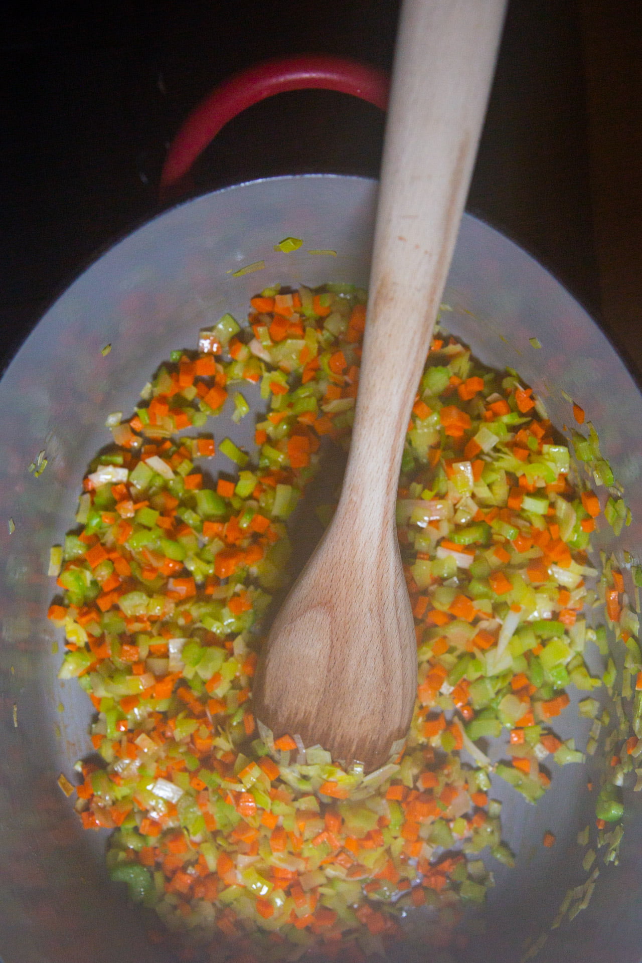Sofrito. Lo importante y la base de sabor de esta receta es el sofrito: poro, apio y zanahoria. Lo puedes hacer en el procesador de alimentos o picarlo lo más fino posible.