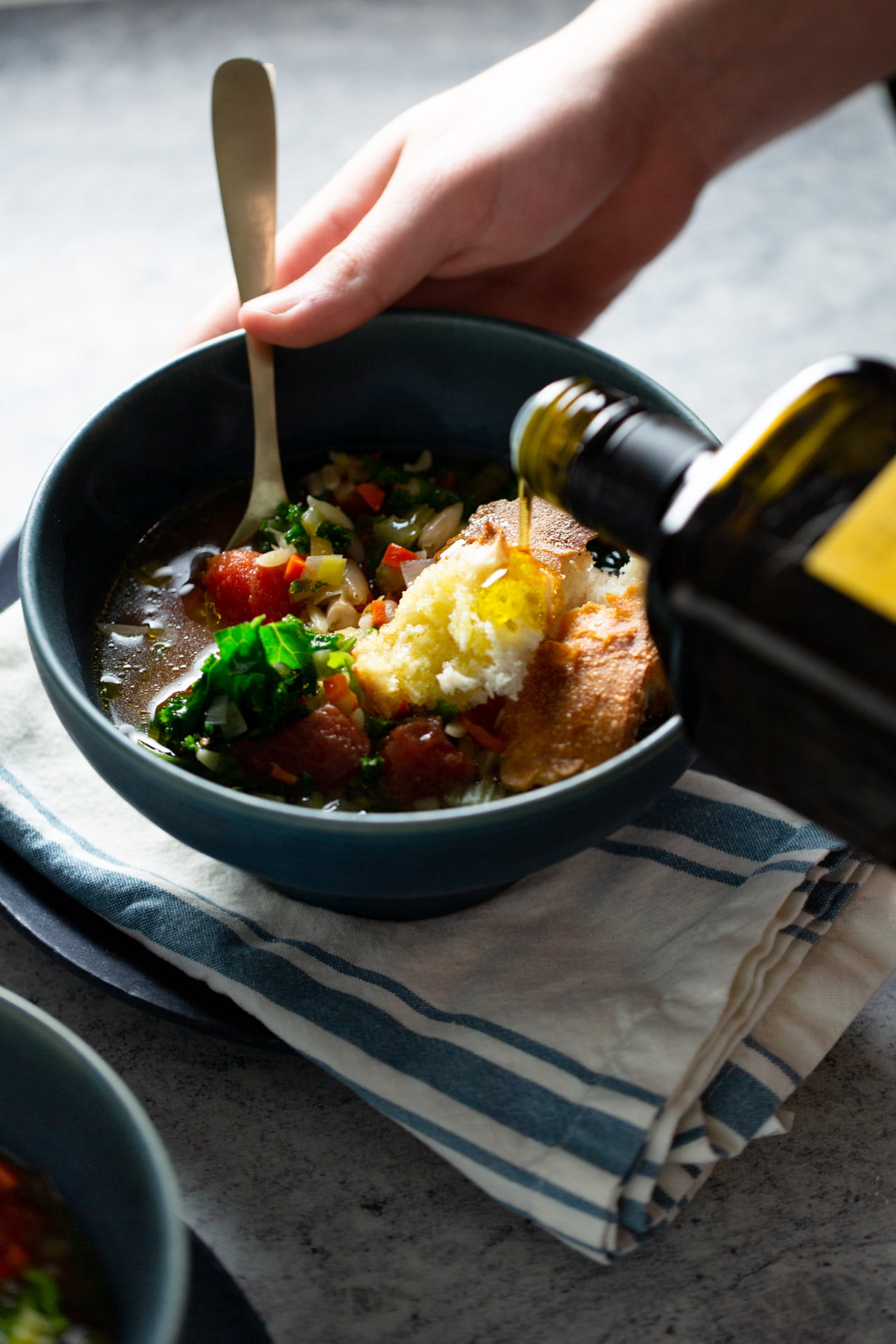 Agrega el agua o el caldo de verduras, el laurel y los frijoles blancos, y deja tapada durante unos 10 minutos. Al final agrega las hojas de verdes, la pasta y tapa por unos 3 minutos. Sirve en tazones de sopa y encima ponle pedazos de pan y baña con un chorrito de aceite de oliva.