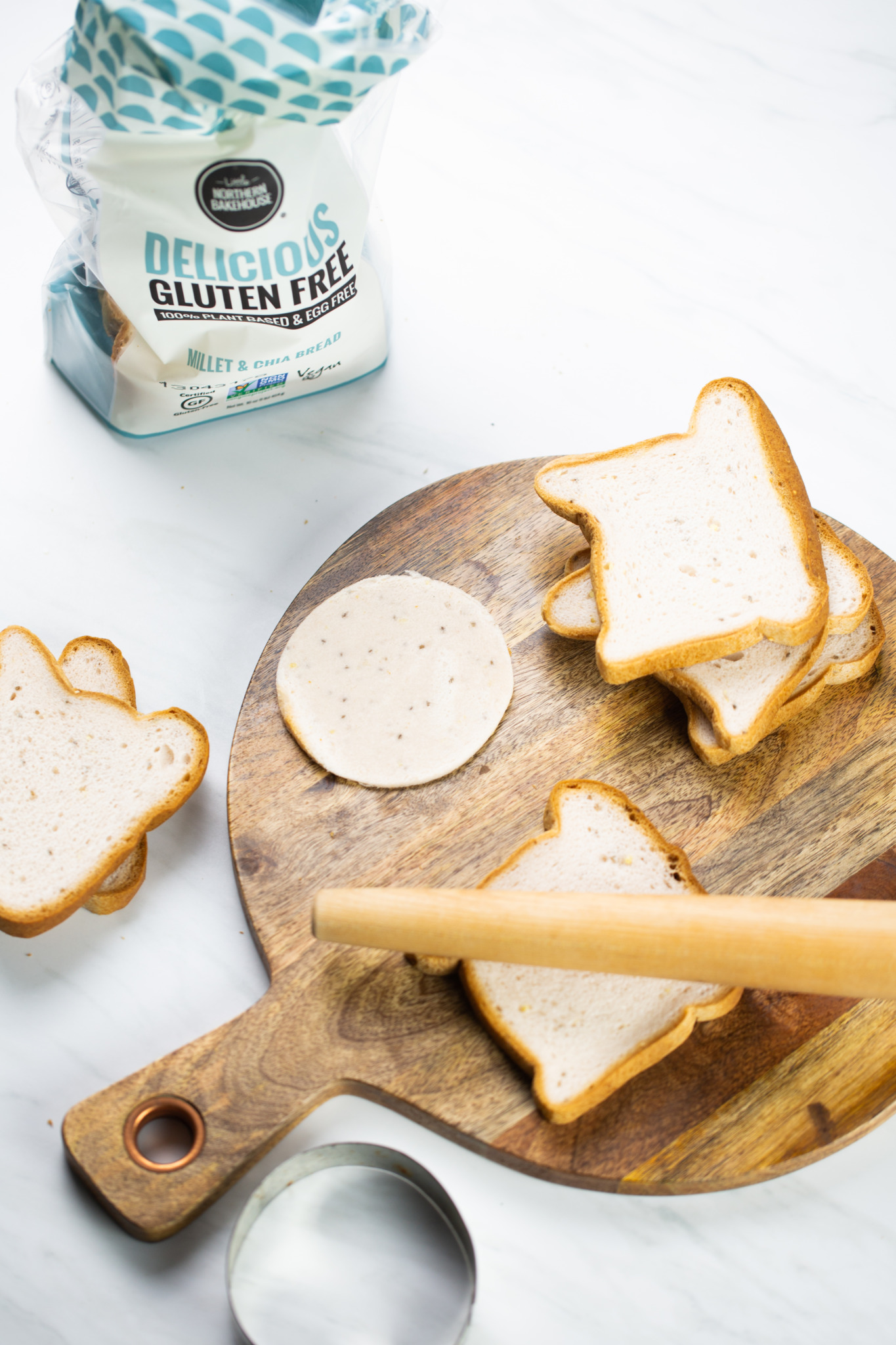 - Para hacer la costra, extiende una rebanada de pan de Mijo y Chia hasta que tenga 1/8 de pulgada o menos de espesor. Córtalo con un cortador de galletas y tuesta en una sartén con tantita mantequilla o aceite de oliva.